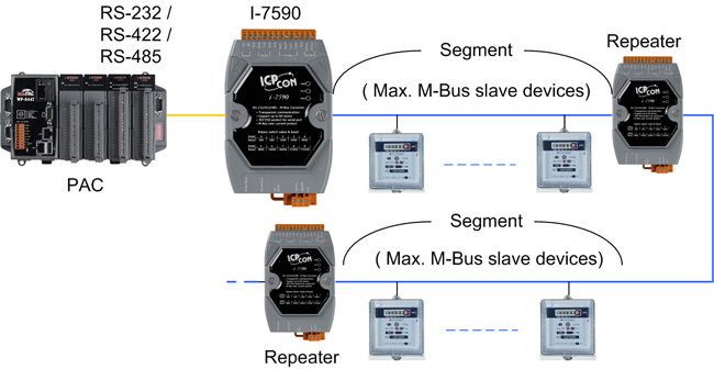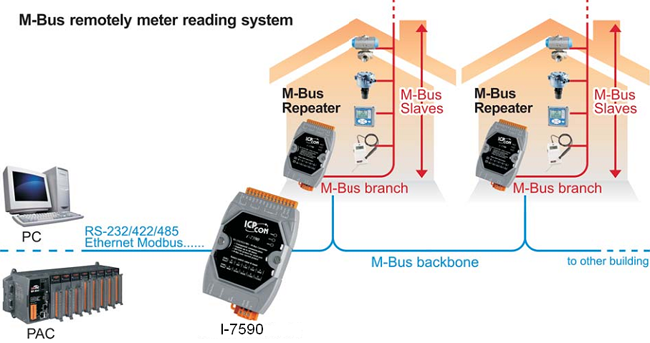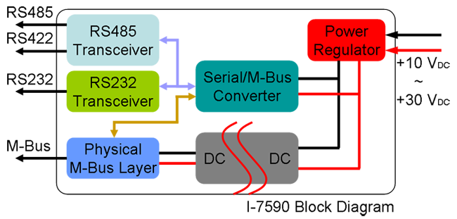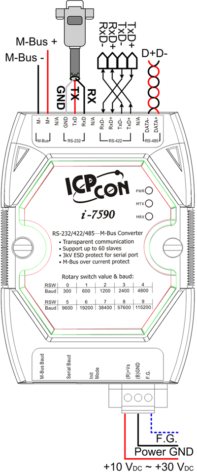 Diseñado para dispositivos esclavos M-Bus, el I-7590 es muy útil como conversor de bus serie a M-Bus. Ofrece conversión de tres tipos de comunicación (RS-232, RS-422 y RS-485) a M-Bus. Dos conmutadores giratorios permiten cambiar rápidamente el modo de baudios del puerto serie a baudios del puerto M-Bus.